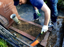 Приехав на кладбище, первым делом мы удалили кустарник, закрывающий памятник. Затем тщательно подмели цветник и территорию участка, после чего вытерли надгробье.